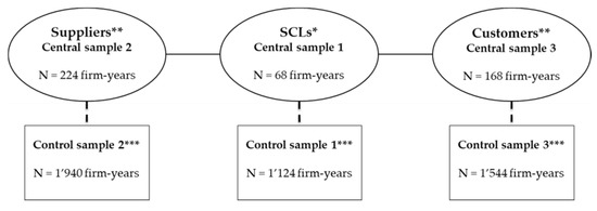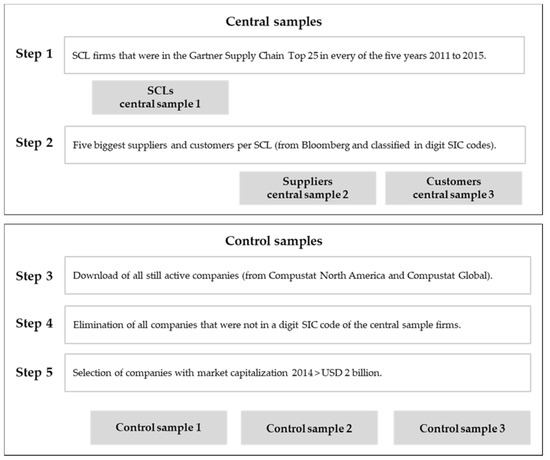 Based on these gaps, the present study tries to answer the following research question: “Do suppliers and customers of SCLs demonstrate superior financial ratios compared to those of other companies from the same industry?” The purpose of this study is to investigate the financial spillover effect in supply chains and whether suppliers and customers may derive beneficial advantages from participating in an SCL’s network. The study is carried out by selecting firms from the three central samples (SCLs, SCL suppliers and SCL customers). We collect financial statement information about SCLs’ key customers and suppliers. The control samples are established by taking firms from the same industry. The analysis is based on secondary data (financial ratios). The usage of secondary data to build or elaborate theory is common in finance research. This is also becoming increasingly common in supply chain and industrial organization research, as suggested by Rabinovich and Cheon [