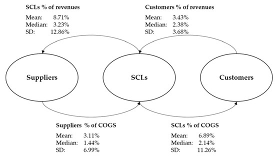 Figure 3. It shows the companies’ percentage of revenue or COGS they impact. For the data information, the mean, median and standard deviation (SD) of the analyzed companies are provided. Generally, it appears that SCLs have a lower percentage (in the mean and the median) in costs and revenues than the suppliers and customers. This shows that SCLs are less dependent on their relationship with suppliers and customers than vice versa. Looking at the suppliers and customers, it becomes clear that suppliers (SCLs % of revenues) are the most dependent companies. They exceed the customers (SCLs % of COGS) by 1.82 percentage points in the mean and by 1.09 percentage points in the median.