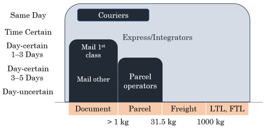 Since this paper will investigate the topic of autonomous trucks and vans from the perspective of CEP companies, it is crucial to present these vital market players. The CEP service providers have a particular significance in urban logistics. This sector can be examined based on two dimensions: time-certainty or speed and weight [11]. The maximum weight of parcels is around 31.5 kg [12]. Couriers deliver lightweight shipments usually on the same day, while express delivery is defined by a fixed time window (within one or two days). Finally, parcel providers consolidate lightweight parcels [11,12,13]. Express is also called integrator because it covers almost every market segment [11]. Figure 1 presents this classification. Some parts of these services are overlapping; hence most of the CEP players offer all of them [12].