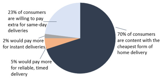 On top of that, current trends also have a massive impact on urban logistics. Population growth and urbanization are continuously increasing the demand for goods and services [1]. Savelsbergh and Van Woensel [1] highlight that by 2050 two-thirds of the world’s population will live in cities. The expansion of emerging markets and globalization are other megatrends that give rise to urban delivery challenges [11]. Another crucial driver is e-commerce, which has given a substantial boost to the business-to-consumer (B2C) sector in recent years [1,11]. Consequently, CEP companies also started to offer same-day delivery options or, in some extreme cases, even instant deliveries in order to “compete with brick-and-mortar retailers” [1]. The desire for speed, instant gratification, and the loss of patience is not a new phenomenon, and companies are trying to build their services around those needs [15]. As a result, consumers are accustomed to real-time services and favor those over regular delivery times [15].