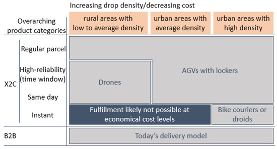 McKinsey and Company [6] also published a matrix with two essential dimensions, one being general customer preferences (regular parcel, high reliability of timing, same-day, and instant delivery) and the second dimension being drop density. The result shows that autonomous ground vehicles (AGVs) with parcel lockers will dominate urban areas with average to high densities (excluding instant deliveries) in the anything-to-customer (X2C) sector [6]. Based on this report, the use of drones is only cost-efficient in rural areas, while droids might be applicable just in case of instant deliveries in dense cities [6]. Figure 3 depicts those findings.