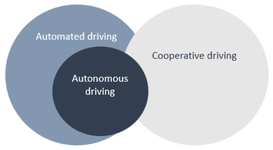 To understand what impact AGVs could have on the CEP industry, we first have to define what is autonomous driving. “Automated driving,” “autonomous driving,” and “cooperative driving” are terminologies often used in a general sense, even though these have different meanings [17]. Based on the definition of smart [17], automated driving means that a specific autonomous (sub)system runs and supports the driver, who is in control of driving. The highest degree version of automated driving is autonomous driving, in which case no human intervention is necessary. Meanwhile, cooperative driving focuses on different technologies, which are important to gain information and communicate in road traffic systems. There are two types of communication: “vehicle-to-vehicle” and between “vehicle and road infrastructure” [17]. Figure 4 shows how the three types of driving overlap.