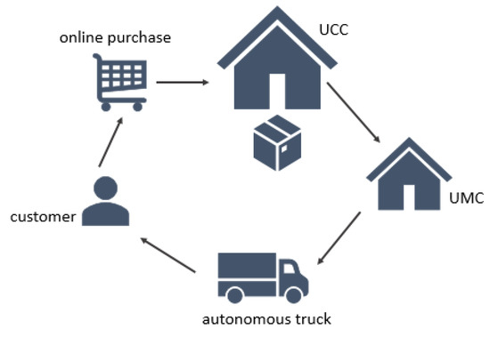 Furthermore, McKinsey and Company [6] accentuates the fact that autonomous trucks will be smaller than regular trucks and thus will need to be reloaded more times. This is one of the reasons why CEP companies could decide to use so-called “city hubs” or “micro-distribution centers” to deliver parcels [12]. Based on Ducret [12], this solution sees widespread usage amongst innovative new players on the market (e.g., last-mile deliveries done with tricycles or mini-vans). It could also be implemented in the case of (electric) AGVs. An urban micro-consolidation center (UMC) or micro distribution center (MDC) would primarily focus on the package sorting (barcodes), loading/unloading of cargo, short-term or overnight storage, delivery scheduling and vehicle maintenance [27]. Figure 6 shows how could UMCs be integrated into the delivery circle of CEP companies.
