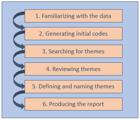 Considering the small sample size and the richness of the data, thematic analysis was chosen as a data analysis method. Based on the definition of Braun and Clarke [30], thematic analysis is “a method for identifying, analyzing, and reporting patterns (themes) within data.” Nowell et al. [31] present in great detail the six phases of the thematic analysis, which is depicted in Figure 7. In this paper, the purpose of the data analysis was to recognize emerging themes and detail these in-depth. This means that particular data gain attention (by being labeled as a code) not because of the number or frequency they appear, but because they capture the information relevant to the overall research question [30]. Of course, the findings were compared to each other, so similarities and differences across the interviews were elaborated to find critical themes and depict different opinions even better. However, this was not done to quantify the initial data, like in the case of content analysis [30].