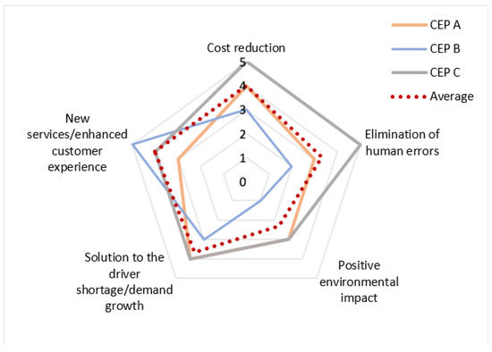 On the other hand, we can also see that CEP companies are already heavily involved in logistical innovations and would like to reshape this whole sector. In a few years’ time, their resources might not be enough to serve the increasing market. The general attitude of Austrian and German experts is decisive when it comes to AVs. This is also in line with other research findings, which state that the majority of experts have a favorable opinion when it comes to business projects related to AVs [52]. The experts highlighted several advantages during the interview. For example, autonomous vehicles could open the door to a wide range of new services (e.g., night-time or scheduled delivery), which are not possible right now. As a result, autonomous vans have a huge chance to become a disruptor.