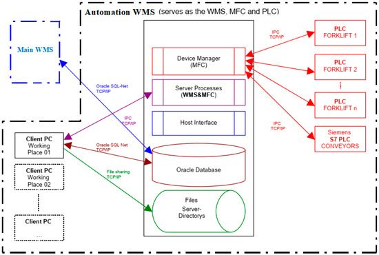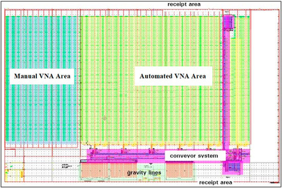 On the manual VNA area, VNA trucks operate on typical back-to-back pallet racks and are supported by the main WMS of the plant. On the automated VNA area, similar back-to-back pallet racks exist, but the operation is handled by eight fully automated VNA trucks. The trucks are fitted with a Wi-Fi antenna that communicates via TCP/IP protocol with the Material Flow Controller (MFC) system. A rough system overview can be seen on