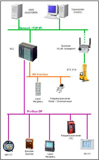 For the conveyor system, which is responsible for shifting pallets in and out of the warehouse, a Siemens control system (PLC) type S7 CPU416-2DP is used. Live plant information is shown through WinCC, a plant visualization software by Siemens S.A. Access to the control system is made through TCP/IP. Peripheral equipment such as light barriers, frequency converters, control panels, etc., are connected to the control system via AS-Interface and Profibus-DP. Actuator Sensor Interface (AS-Interface) is an industrial networking solution with physical layer, protocol and data access methods that is used in PLC-based automation systems, for connecting devices such as rotary encoders, sensors, actuators, push buttons and analog inputs and outputs. Profibus Decentralized Peripherals (Profibus-DP) is used in automation applications in order to operate actuators and sensors via a centralized controller. Data exchange with the automated trucks in the pallet warehouse is made by the internal Wireless LAN (TCP/IP), directly with the Siemens standard functions. A Scalance WLAN Access-point is installed in all trucks and communication with the WMS is achieved by internal network, through protocol RFC 1006. A visual representation can be seen in