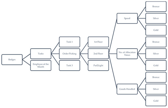 Furthermore, badges are of equal importance as points and cannot be excluded from the gamified system. Therefore, it is essential to pay close attention to their design process. Each task performed can be a distinctive category of the warehouse processes and, by extension, every category should be represented by its own badges. Every task, such as order picking, can be further divided in zones, if required, namely picking at the first floor, picking at the second floor, picking with the put2light system, etc. There are three key metrics in every zone, i.e., speed, the number of times the task is allocated to the worker, and the amount of total goods handled. Then, all metrics are subcategorized to define the different levels of expertise, i.e., bronze, silver, and gold. Finally, there is also another set of badges, totally independent from the previous ones, for the employee of the month, where the respective data will come from the total number of points collected. A typical Badges’ Structure, as described above, is presented in Figure 1.