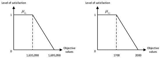 According to Zimmermann’s approach, a fuzzy solution is given by the intersection of all fuzzy objective functions and constraints [35]. A solution x is feasible in degree if . Using Equations (19) and (21), fuzzy constraints and can be rewritten as follows: