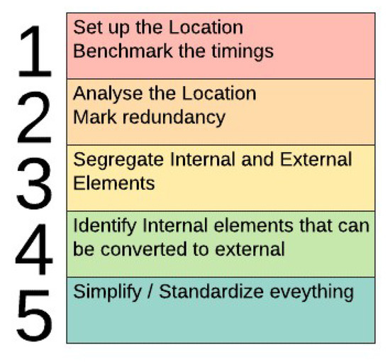 The SMED analysis should begin with the detailing of the process and the time study. The internal activities which cannot be eliminated or converted should be replaced, combined, and simplified [19]. Here the primary job is to highlight the individual activities being done and then try to separate it. There are two types of activities that are undertaken in the changeover [20,21].