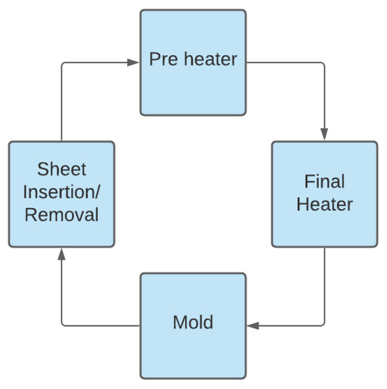 For this project, a SMED study was conducted on a rotary thermoformer in a medium-scale production facility. The thermoformer creates plastic parts for the refrigerator and freezer. To produce different parts of plastic in the same machine, the form must be changed on average once every shift. This machine is capable of producing a part every 32 s. On average, the changeover occurs once per shift with three shifts in a day. The machine process is shown in Figure 3. It consists of two different sections of heating, one section for insertion and another for the mold. This machine runs 24/7 every day, as it is considered a production bottleneck for the specific parts. Hence the downtime losses for the changeover are high. A single operator was charged with the changeover during the initial implementation. The team video recorded the changeover and analyzed each video to perform time and motion studies. Each task was individualized and required time and steps taken by the operator to do it were calculated. The distance travelled by the operator was measured in steps and three steps were approximated to one-meter distance travelled. The implementation was done in 5 stages described as in Section 3.1.