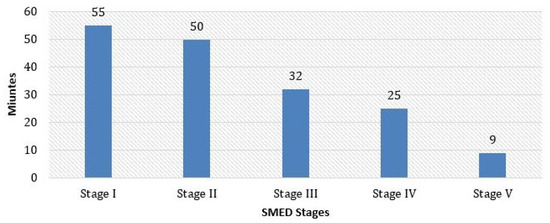 The reduction in changeover time of each stage of SMED is shown in Figure 5. We observe that there is not much improvement in the second stage and the fourth stage. In contrast, the application of stages three and five results in a more significant change in the time reduction. The results show that the time reduction is large when external processes are eliminated (represented by Stage III) or modifications to the machines are made (represented by Stage V).