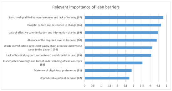It is clear from Table 4 that the most important barrier faced by healthcare organisations when they attempt to deploy lean initiative in their supply chain is scarcity of qualified human resources and lack of training (B7) with importance of 4.80. Most participants agreed that absence of well-trained employees constitutes the most challenge to start a lean journey. Some respondents mentioned that without qualified people, it is impossible to start a lean project. This was followed by hospital culture and resistance to change (B6), lack of effective communication and information sharing (B9), absence of the required level of leanness (B8), and the identifying type of waste through hospital supply chain processes (delivering value to the patient) (B4) with relative importance of 4.67, 4.47, 4.40, and 4.13, respectively. In order to assess if there is any significant difference between the experts’ opinions on the various barriers, the standard deviation is shown for each barrier in Table 4. As it can be seen, this is well controlled within 10 to 15%. It should be noted that analysis of variance was not conducted to compare the means, as the set of response for each barrier cannot be considered as a sample from the population of answers.
