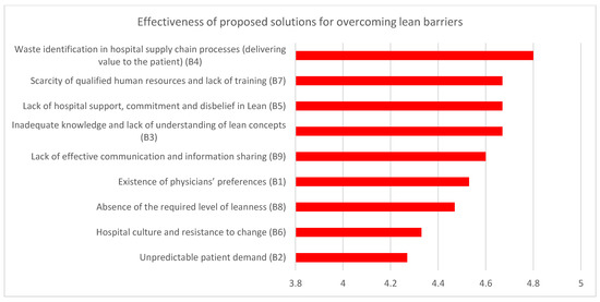 Figure 4 represents relative importance of lean barriers in HSCM. Based on interviewees, the proposed solutions can contribute effectively to overcome the barriers. For example, the suggested solutions can overcome the barrier to overcome Scarcity of qualified human resources and lack of training challenge with 96% effectiveness. Table 4 and Figure 5 illustrate the extent to which proposed solutions can effectively overcome barriers when implementing lean in SCM. The results presented are in agreement with similar studies presented in the past, for example with the ones presented by Albliwi et al. [28]. In a similar way as with the barriers, the standard deviation was calculated for each solution, and follows similar behaviour as with the barriers.