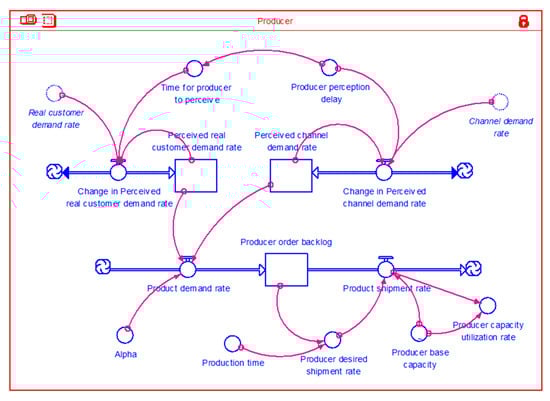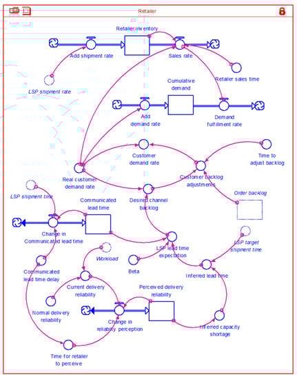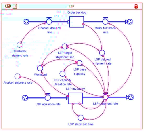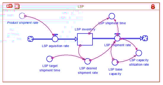 In this section, we illustrate the model for each structure scenario from the producer’s production to the LSP’s operation and finally to the retailer’s order fulfillment. According to the dynamic resource-based view, strategic assets are modelled as stocks (in rectangles) of available tangible or intangible factors in a given time. Their dynamics depend on the value of corresponding inflows and outflows [55]. Such flows are modelled as “valves” that directly change the rate of evolution of each strategic resource [56]. The source and sink of each strategic resource are represented by a cloud symbol. The source has an arrow coming out, while the sink has an arrow going into the cloud [23]. There are two typical processes in a system dynamics model [57] (pp. 411–434). One is known as a material delay, since it captures the physical flow of material through a delay process. In a material delay, the stock level accumulates at a rate equal to the difference between the inflow and outflow rates. The other kind of delay, which represents the gradual adjustment of a perception or belief, is called an information delay. Because information, unlike material, is not conserved, a bi-flow structure (i.e., that can be both increased and decreased) is needed to capture an information delay. The stock level adjusts to the actual information input in proportion to the size of the difference in one’s belief. An adjustment time/delay determines how rapidly one’s belief responds to the difference.