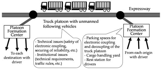 One of the possible countermeasures for sustainable and efficient SCM is automation in freight transportation. In recent years, the development of various new technologies related to automation has progressed rapidly around the world to improve labor-savings and efficiency in freight transportation. Among the recent key trends and innovations in SCM, one of the technologies with the highest impact is self-driving vehicles (SDVs) []. In order to implement SDVs, it is necessary to integrate new technologies, such as Artificial Intelligence (AI) and the Internet of Things (IoT), as well as to comply with laws and regulations focusing on safe driving in each country. In the logistics industry, SDVs are expected to be used in a variety of transportation, from long-distance trucking to last-mile delivery. Fully automated vehicles (FAVs) are already being used in completely closed environments such as mines and ports, while on public roads, demonstration tests are still being conducted in limited areas under legal restrictions. As a major solution for improving the efficiency of long-haul trucking, truck platooning, which involves a small convoy of freight vehicles using electronic coupling with semi-automated driving, has been under technological development since the early 2000s []. Truck platooning is expected to reduce environmental burdens by reducing the air resistance of following trucks and could be a possible solution for the labor shortage problem.