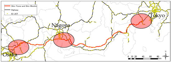 Major cities and industries in Japan are geographically concentrated along the Pacific coast, especially between Tokyo, Nagoya and Osaka, as shown in Figure 2. The Shin-Tomei and Shin-Meishin expressways were opened in the 2010s with a high-standard design as an alternative route to the existing, dilapidated expressways between the three major cities. At first, the facility development plan for truck platooning was under discussion on the Shin-Tomei and Shin-Meishin expressways []. In this plan, the approximate candidate sites of three PFCs were proposed near the interchange of the major corridor and outer ring roads in the suburbs of three major cities, shown as the red circled areas in Figure 2.