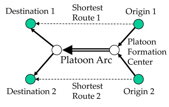 We assume a simple route choice in the case of two trucks, as shown in Figure 3, to explain the effect of truck platooning formation. Both trucks need to make a detour to form a platoon, but this is a waste of time and cost for both trucks. To make the truck platooning more advantageous than the shortest route with a single truck trip, cost reduction on the platoon arc is quite an important factor, including saving fuel consumption and labor cost by platooning. Therefore, the cost factor of platooning (α) is adopted in the platoon arc.