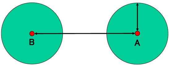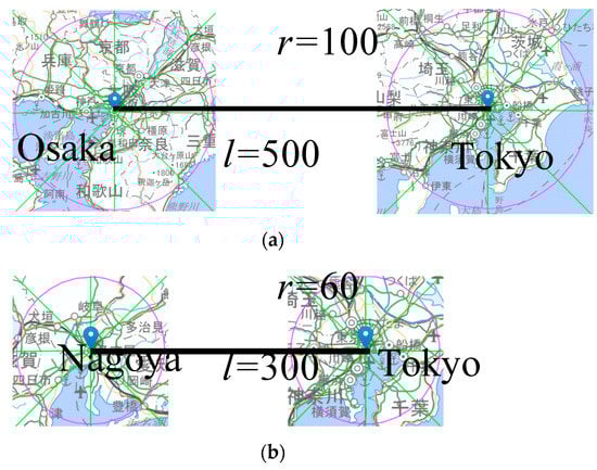 The formulation and assumption of this model are as follows. As shown in Figure 4, we consider the two circled regions A and B, whose radii are r, and the distance between two regions is l. The long-haul ratio x (x > 2) is deployed to consider the relationship between l and r as follows: in general, the long-haul ratio x becomes larger as the distance between two regions l becomes longer with a fixed radius r.