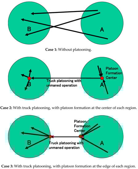 For the introduction of unmanned truck platooning, infrastructure improvement, laws and regulations and commercialization have been discussed. In particular, the truck platooning trials conducted in Japan revealed some issues related to infrastructure. For example, there is a need for a dedicated or prioritized lane for truck platooning and a facility for the formation of truck platooning to switch the drivers in the following truck in the platoon. Bhoopalam et al. [] provided a framework to classify various new transportation planning problems that arise in truck platooning, as well as surveying relevant operational research models for these problems in the literature. In an overview of previous optimization studies of truck platooning schemes, literature on the planning, scheduling and routing of the operational side of truck platooning has been proposed, but research on facility locations on the strategic side has been quite limited. Therefore, this research focuses on facility locations for the formation of truck platooning for unmanned truck platooning. Continuous approximation (CA) is an efficient and effective technique for modeling complex and uncertain logistics problems, especially in the areas of facility locations []. In this study, we introduce the current status of truck platooning trials in Japan and summarize the related plan of truck platooning formation. Considering the case of the unmanned truck platooning system in Japan, we present an optimal location analysis to minimize the total operation cost of truck platooning using the CA model and discuss the implications of the computational results with a numerical experiment of the case of Japan.