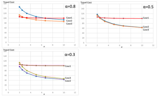 Figure 6 shows the comparison between the cost functions in cases 1, 2 and 3 with the change in the cost factor with platooning (α) using the long-haul ratio x is as follows: for the low cost reduction scenario, α = 0.8; for the middle cost reduction scenario, α = 0.5; and for the high cost reduction scenario, α = 0.3. We can observe that the travel cost in Case 3 is the cheapest case in scenarios where α = 0.8 and 0.5, but not for x = 2, and the travel cost in Case 2 is the cheapest case in the scenario where α = 0.3. Case 1 is the cheapest case in α = 0.8 and 0.5 only where x = 2; i.e., the situation that two circles come into contact with each other. In conclusion, Case 2 is the optimal location as the cost factor with platooning (α) becomes smaller, but Case 3 is the optimal location for most scenarios. Case 1, without platooning, is the optimal route choice only in the special case that two regions are located close to one another.