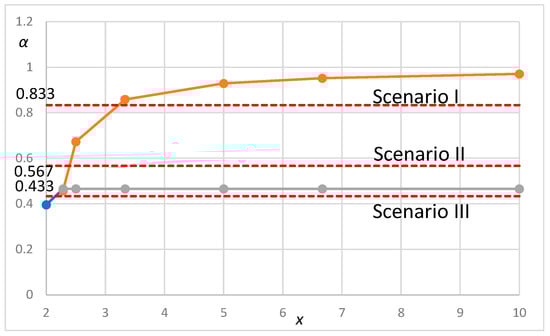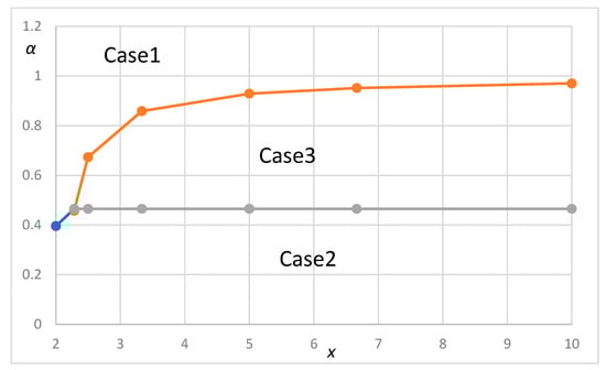 From Equations (5)–(7), we can obtain the results that show the dominant combination of x and the cost factor with platooning (α) for all three cases, as shown in Figure 7. The border of Case 1 and Case 2 is a quadratic function based on Equation (5), but the length of this border is quite short. The border of Case 1 and Case 3 is also a quadratic function based on Equation (6). The border of Case 2 and Case 3 is a constant value to x based on Equation (7). Three borders meet at the point α = (=0.465) and x = 2.284.