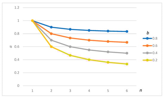 The cost factor with platooning (α) with the number of vehicles in a platoon (n) and travel cost per vehicle following in the truck platoon (b).