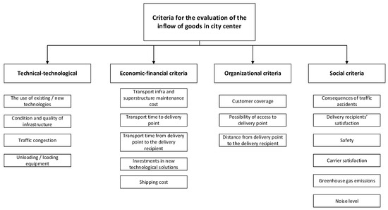 In selecting the criteria, the authors considered those related to the general development of the city center, such as greenhouse gas emissions, noise levels, investment in new/existing technologies, etc. [4,17,18,19,20,21] and criteria related to the organization of delivery activities. The authors have divided the criteria for evaluating the inflow flow of goods in city centers into four groups: technical-technological criteria group, economic-financial criteria group, organizational criteria group and social criteria group. This represents the second step of this research.