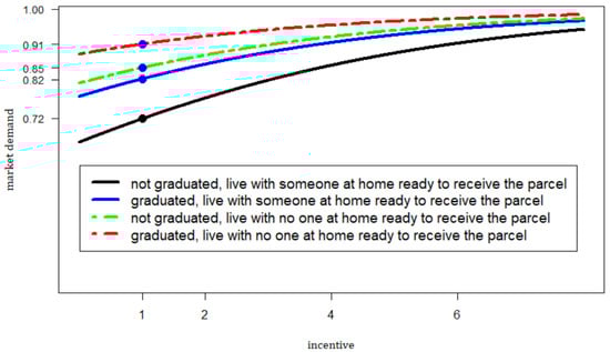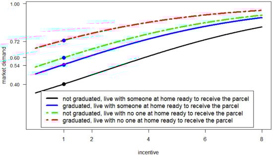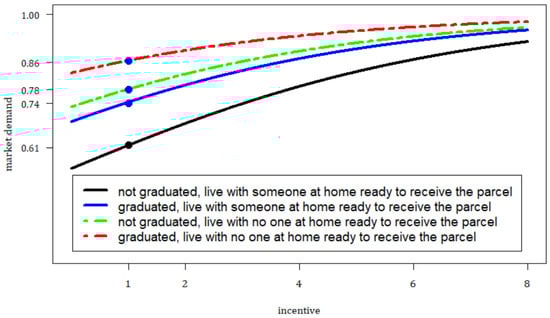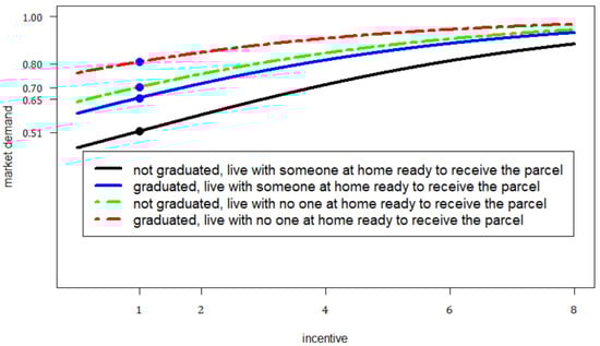 Scenario II depicts an overall higher market demand for PLs than the previous scenarios, ranging from 86% to 61% when considering an incentive of EUR 1. Living with no one at home ready to receive the parcel represents a key condition for the high market demand independent of the education level (86% or 78%). However, even with someone at home, the demand is still high at 74% and 61% for graduated and non-graduated participants, respectively.