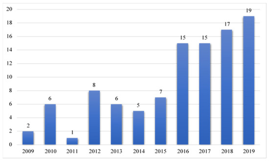 The annual distribution of the number of articles published from 2009 to 2019 is shown in Figure 1. It is observed that most articles were selected in recent years. 28 articles out of 101 were published between 2009 and 2014, while the rest of the articles (73) were published from 2015 to 2019.