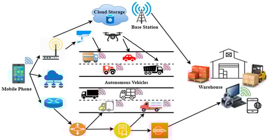 Moreover, the revolutions in transportation systems, telecommunications, and vehicular technologies create opportunities for controlling the supply chain and logistics operations []. An intelligent transportation system develops the capability to guide the driver to the destination by providing optimal routing information in real-time traffic conditions [] and/or by finding optimal routes with less fuel consumption []. Therefore, adopting innovative technologies for autonomous vehicles, big data, and the internet of things (IoT) will resolve unforeseeable challenges in the transportation sector []. Further-more, cloud computing increases supply chain efficiency through increased visibility and collaboration in order processing, inventory management, warehousing, and logistics []. The assimilation of Internet of Things (IoT) to cloud-based system enables dynamic management of vehicle routing operations by inter-communication, connection, and action among various supply chain components [] as proposed in Figure 1.