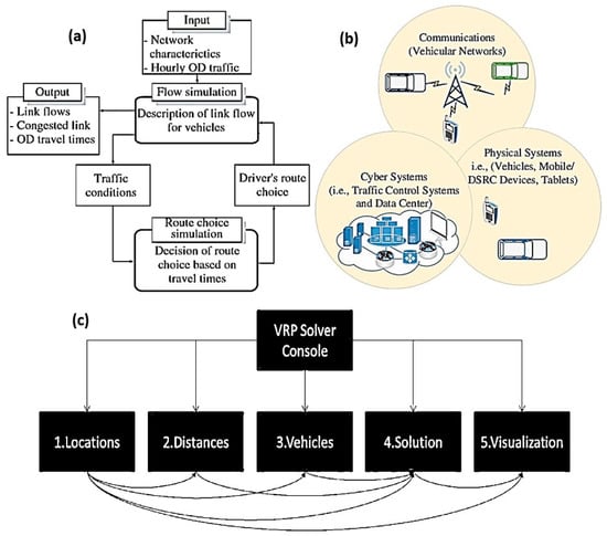 Big-data based algorithms are increasingly used in intelligent transportation systems (ITS) for a variety of applications in recognition of traffic signals, detection of objects, prediction of traffic flow, and planning of travel times and routes []. One such example is the development of an Android application for automatic capturing and image processing using mobile devices’ integrated camera systems for the detection of stolen cars, management of parking systems, and verification of license plates []. Very recently, nine disruptive technologies such as additive manufacturing, artificial intelligence (AI), automated robots, autonomous vehicles, big data analytics, blockchain, drones, electric vehicles (EV), and the internet of things (IoT) were identified as the emerging disruptive technologies expected to affect logistics and transportation []. Intelligent cloud-based technology is making a significant impact on the logistics sector, as cloud computing is used for autonomous logistics to synchronize the real time flow of material and information []. IoT utilizing cyber-physical systems (CPS), equipped with electronics and software, connects the physical system with the digital world to optimize the system’s performance []. Vehicular cyber-physical systems (VCPS) are designed for smart roads by realizing mobile cloud computing services where vehicles and mobile devices are connected to both cloud servers and clients [], as illustrated in Figure 2b. Open source VRP Spreadsheet Solver designed to work by storing information in the server console and supplying information to the worksheet of locations, distances, vehicles, solution and visualization [], as shown in Figure 2c with the illustration of information flow. A smartphone-based prototype application was developed for cargo transportation using an information and communication technology (ICT) based service [].