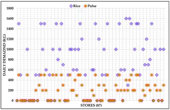 Consider a chain of retail superstores facing challenges distributing several products from its warehouse to different outlets/stores due to scheduling and routing issues. The retail chain is located in Dhaka, Bangladesh, and experiences an inefficient distribution plan with higher transportation costs []. Thus, this research was carried out to optimize the scheduling and vehicle routing in supplying goods from the distribution center to outlets. As a current practice, manual scheduling and routing are used to deliver products using limited capacity vehicles. Hence, the optimal output is not achieved due to the extra traveling of vehicles. Moreover, the traffic conditions in Dhaka city are often affected by congestion and traffic jams. Therefore, an optimal route is required to respond to the dynamic traffic conditions. Additionally, navigating on the road without knowing the real-time traffic conditions undermines the product delivery target for the stores. Hence, this paper attempts to implement intelligent vehicle routing and scheduling to improve the distribution system by reducing the transportation distance and time. Daily demand information obtained for two different commodities (rice and pulse) for 87 stores/outlets is shown graphically in Figure 3. Demands are fulfilled daily from the central warehouse (depot) using the vehicles (covered van) to the store/outlets.