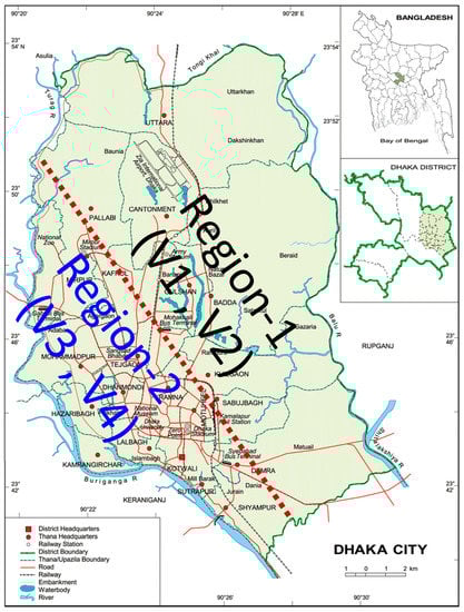 The capital city of Bangladesh, also known as of Dhaka City Corporations (North and South), lies between 23.69° and 23.89° North latitudes and 90.33° and 90.44° East longitudes []. Due to inadequate space and road infrastructure, frequent traffic congestion results in severe economic losses in the transport system in Dhaka city []. The government has initiated comprehensive transport planning and infrastructure programs to improve the traffic conditions []. This initiative has increased wider roads and improved the traffic conditions in the newly developing areas (North-East part) of Dhaka city. Thus, a dotted line has been drawn on the map of Dhaka city [] to identify newly developing areas (Region-1) and old areas (Region-2), as shown in Figure 4. In this study, transportation assignments were considered for vehicle routing as vehicle V1 and V2 for Region-1 and V3 and V4 for Region-2, respectively.