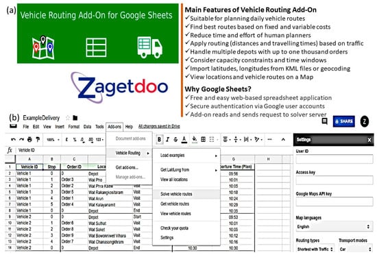 The scheduling process considers the maximum number of stores/outlets that a vehicle can attend with its capacity-constraint (weight) based on the demand at nodes (outlets). The approach appoints the minimum number of vehicles required to serve the nodes (outlets), thereby reducing the number of vehicles. An open-source spreadsheet-based solver can be used for the Vehicle Routing Problem (VRP) where the server console stores information for other worksheets (elements) of locations, distances, vehicles, solutions, and visualizations [], as is illustrated in Figure 2c. Google Sheets, a free web-based spreadsheet application, was used for vehicle scheduling in the present study. To integrate the road traffic condition, the vehicle routing add-on feature is added on the Google Sheet. Figure 5 shows the key features of the vehicle routing add-on and options for the route solver worksheet developed by Zagetoo []. Therefore, manual human efforts were needed less for scheduling the activity due to using the added feature of location and route visibility on Google Maps. The application solver uses information about the store’s demand, location, available vehicle, and vehicle capacity constraints for scheduling and routing solutions in real-time traffic conditions.