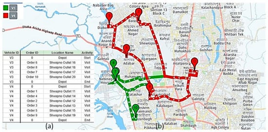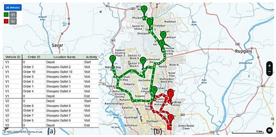To begin the scheduling process, a Google spreadsheet was opened from the desktop browser and ‘vehicle routing add-on’ was added to the Google Sheet. Information from Table 1 was added in the location tab for the location ID, latitude, longitude, address of depot (warehouse), and outlets (stores). Then, vehicle and order information was added to the vehicle and order sections accordingly by following the procedure of Zagetoo []. The application solves the problem once “Solve Vehicle Routes” is clicked. Visualization is seen from “View vehicle routes” feature. Moreover, the route sequencing of vehicles is available at “Route” section at the footer. Once all the necessary information was updated for vehicle 1 and vehicle 2 in Region-1, the vehicle routing solver worked to maximize capacity utilization and cover the maximum number of outlets (stores). The solution of scheduling and delivery sequence for Region-1 is shown in Figure 6.