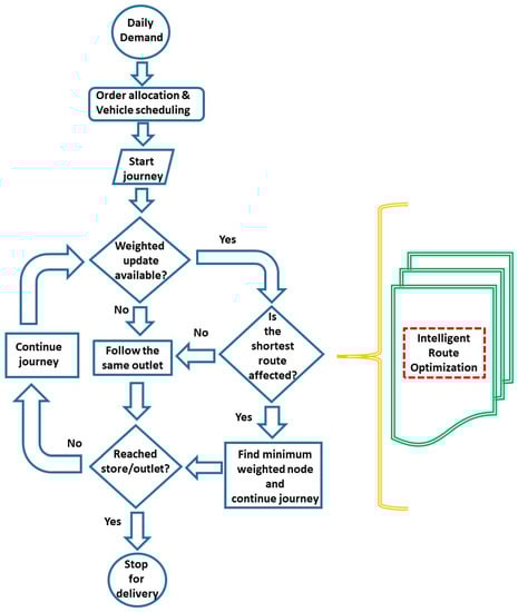 There are many ways to travel from one outlet to another, and thus, many nodes may arise from the depot to reach the destination (outlets). Moreover, as the road traffic conditions are constantly changing, navigating the vehicles based on instant traffic conditions from one outlet to another is crucial to obtain an efficient and optimal routing output. Therefore, the Dynamic Vehicle Routing Problem (DVRP) considers the optimization algorithm to monitor the movement of individual vehicles according to the traffic conditions []. In response to changes in the real-time traffic conditions, the optimizer can update the vehicles’ schedules by re-optimizing the route. Therefore, in this study, an attempt was made to develop an intelligent route optimizer process flow shown in Figure 8 based on the vehicle routing approach [] with the concept of real-time fleet management systems []. For the shortest traveling distance between the depot (warehouse) and nodes (outlets/stores), an appropriate weight was considered for the distance between them. The computation was progressed by choosing the smallest distance among the adjacent nodes’ distances. The process continued for generating the path by identifying all adjacent nodes related to the current nodes. The nodes’ weights were added to the current nodes to compute their distance to other nodes to reach the destination. However, the change of the nodes occurred only if it was less than the previous one. The weightage was calculated from previous nodes to current nodes based on adjacent nodes. After completing the algorithm, the shortest route was selected. If any obstruction arises on the selected path, the edges of weight re-evaluate and find another shortest path. Thus, the application (app) process flow was developed based on artificial intelligence to respond to the real-time data of traffic that makes the vehicle routing intelligent.