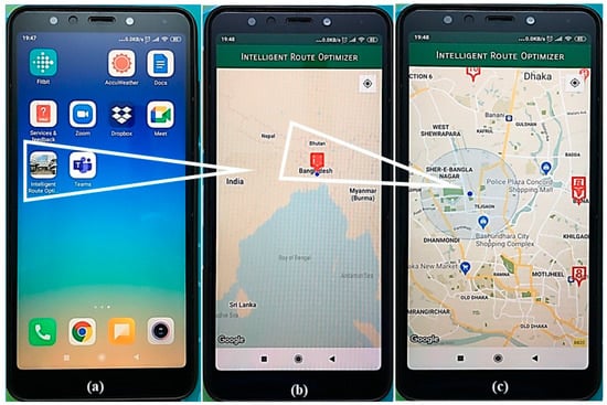 For this study, we developed an intelligent route optimizer app in the Google platform by utilizing the amiable operating system of Android Studio 4.0. The application icon is shown in Figure 9a. The map of Bangladesh is located on the user interface once the application icon is tapped, as shown in Figure 9b. The center location icon helps to identify the user’s current location, as shown in Figure 9c.