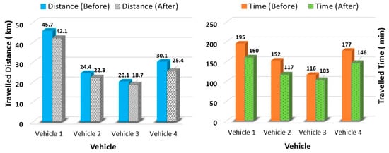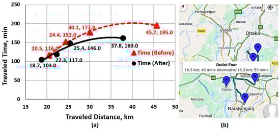 Figure 11 shows the vehicle-wise traveled distance and time before and after implementing the intelligent route optimizer. It was observed that the traveled distance for vehicle 1, vehicle 2, vehicle 3 and vehicle 4 are reduced by 3.6 km, 2.1 km, 1.4 km, and 4.7 km, respectively. Moreover, the traveled time is reduced for vehicle 1, vehicle 2, vehicle 3 and vehicle 4 are 35 min, 35 min, 13 min, and 31 min, respectively. In this instance, Figure 12a provides valuable information of traveled time with distance before and after implementing the intelligent route optimizer. The travel time and distance follow similar behavior as observed [] with empirical results of road transportation.