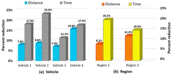 Percent reductions of distance and time for (a) each individual vehicle; (b) each region.