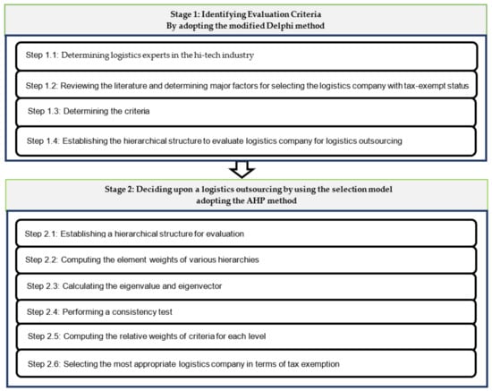 Stage 1: The modified Delphi method [,,,] was used to accumulate and integrate expert opinions. Subsequently, normal evaluation criteria were determined. The steps involved in the modified Delphi method are outlined as follows: Step 1.1: determining logistics experts in the high-tech industry, Step 1.2: reviewing the literature and determining major factors for selecting logistics companies with tax-exempt status, Step 1.3: establishing the criteria, and Step 1.4: establishing the hierarchical structure to evaluate logistics companies for outsourcing to the next stage of the AHP hierarchical structure [].