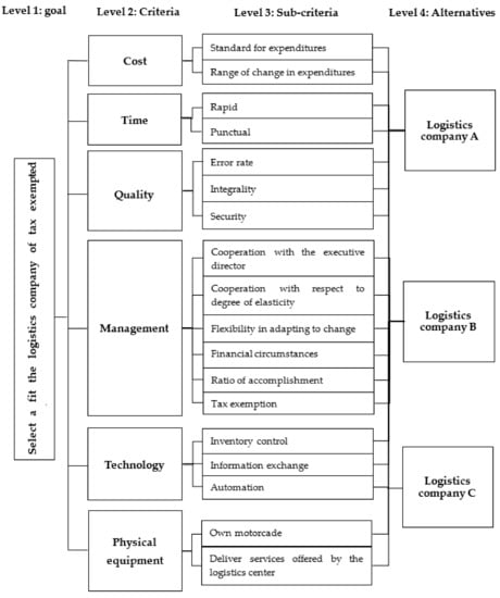 For a logistics company with tax-exempt outsourcing, the hierarchical structure included the goal, criterion, subcriterion, and alternative levels (Figure 2).