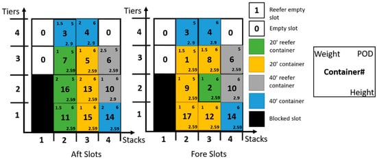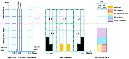 A cell results from the intersection between the horizontal tier and the vertical stack. It can either hold a single 40′ container or two 20′ containers as shown in Figure 2c. A cell consists of a fore-slot (bow-side position) and an aft-slot (stern-side position). Some of these cells/slots have access to power plugs to provide electricity to reefer containers. They are termed ‘reefer cells/slots’ as shown in Figure 2b. Finally, each container stack has weight and height limit restrictions.
