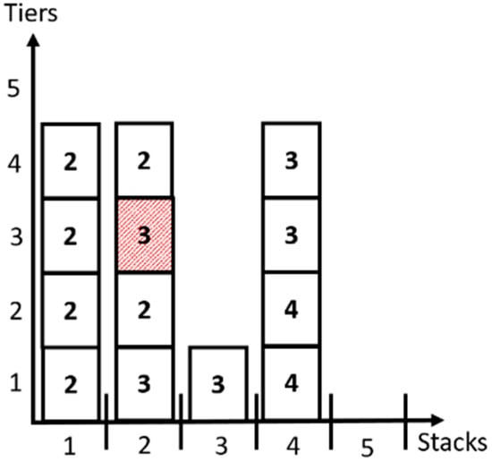 - The number of non-empty stacks (i.e., used stack) is minimized. A penalty of PS = 10 units is paid if there is at least one container located in a stack. For example, in Figure 3, the total penalty is 40 for the four occupied stacks added to the objective function.