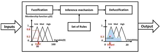 Fuzzy Logic can be considered a rule-based approach []. It is composed of fuzzy sets; the elements in any fuzzy set take a different degree of membership (weights) within an interval [0, 1], called the membership functions. Fuzzy logic allows the association of crisp quantitative values of the variables (e.g., weight, height) with linguistic terms (e.g., “light”, “heavy”, “high, “low”, etc…) to determine the output with the introduction of some rules. A Mamdani-type fuzzy system [] is used in this research. A Mamdani-type fuzzy system consists of three consecutive phases: fuzzification, inference mechanism with fuzzy rule-base, and defuzzification [], as shown in Figure 4.