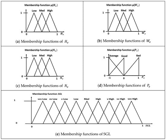 Triangular membership functions are employed as they are the most common and they best describe the situation [,]. The first three input variables shown in Figure 5a–c, have the same triangular membership functions. Each variable has three linguistic variables (i.e., “Low”, “Med”, and “High”). On the other hand, the membership function of is also triangular, however, it is slightly different due to the nature of the variable. It is shown in Figure 5d.
