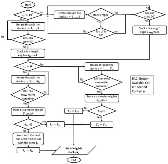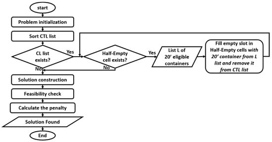 The proposed slot planning problem solution is an iterative process, as it pairs a container form the CTL list with a slot/cell in a certain stack from the set of eligible stacks . Figure 6, illustrates the flow chart of the proposed problem solution algorithm. The flow chart of Figure 6, contains the following main steps: