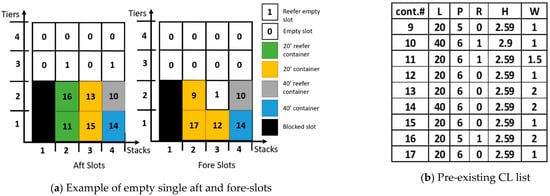 Since this paper is only concerned with the second phase of the stowage planning problem (the slot planning problem), it takes the output of the first phase (the multi-port master planning problem) as its given input. The first phase produces a list of Containers-To-Load (CTL) for each location on the ship. In some cases, there are locations that have pre-existing containers, and their exact positions are given. These containers are grouped into a Containers-Loaded (CL) list. The elements of this list cannot be changed at any stage of the problem solution (i.e., the positions of the pre-existing containers within the location cannot change). The CL list is considered the initial condition of the slot planning problem.