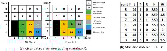 The output of this phase is the input of the slot planning phase. The CTLAll Vessel is consequently subdivided into (n) lists (Containers-To-Load list for each location) (CTL(1) to CTL(n)) each of which would be required to undergo a second phase of optimization (Phase 2) with a Slot Planning Algorithm (SPA) to satisfy the low-level constraints and objectives. This approach is the most successful in terms of model accuracy and scalability []. This phase is can be either performed by the shipping line or the terminal’s operators to optimize the loading sequencing [].