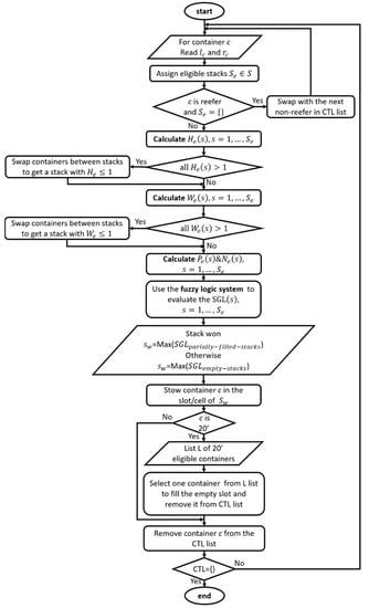 Valdés-González et al. [] introduced a fuzzy logic based intelligent system for container stacking. The system had a distinct criterion for a real-time decision for accepting or rejecting an entry request to the stacking areas of the port in Valparaiso, Chile. Rekik and Elkosantini [] used a multi-agent system coupled with a fuzzy logic framework for the online container stacking in ports.